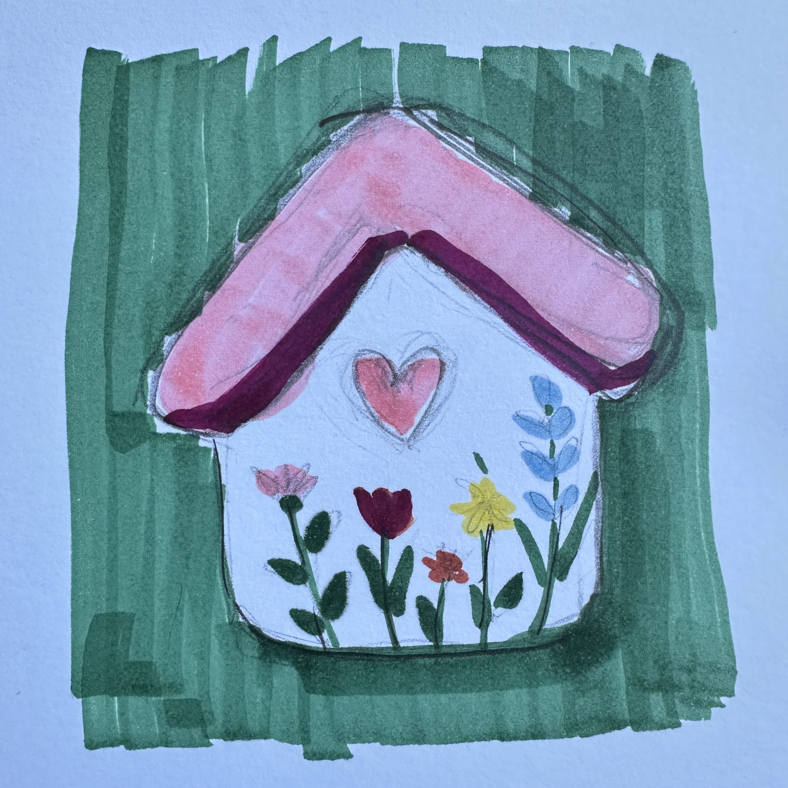 Първоначална скица с молив на къщичка с цветя, използвана като шаблон за сухо плъстене.