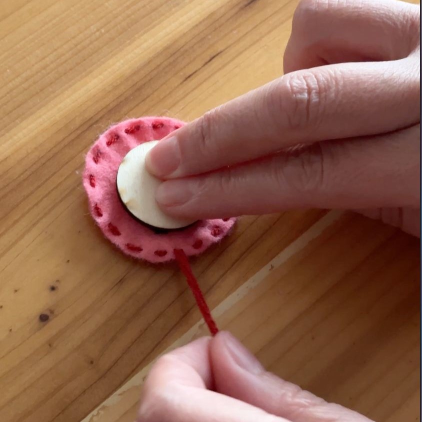 Вместо да пълни брошката с вата, което понякога води до неравности, Вили използва дървената шайба за основа. Първо минава с тропоска по края на филца, поставя дървената основа и стяга конеца. Така гърбът става чист и прибран, без излишни гънки.