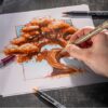 The card is porous enough to stick dry drawing media to it, it keeps the sharp lines of ink without letting them bloom, and it is dense enough for the wetter inks and paints – a useful purchase for people used to working with a wide range of techniques at the same time and combining them.