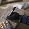 A black industrial universal permanent marker with xylene-based ink and a pigment that is resistant to rubbing, it has a bullet tip.