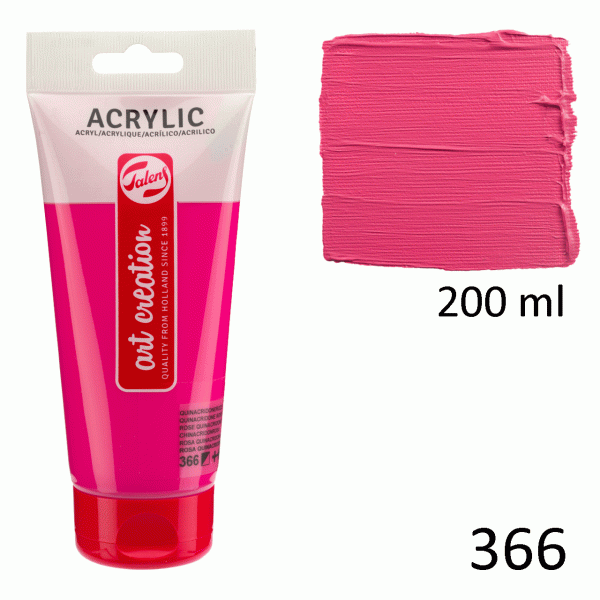 Розова акрилна боя от серията на Таленс Art Creation. Розовия Хинакридонов (366) е полупокривен цвят (◩) с отлична светлоустойчивост (+++).