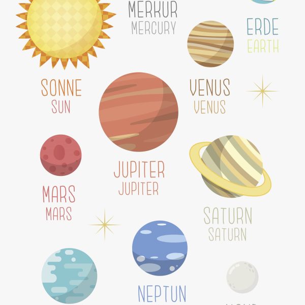 Листовете са запълнени с над 60 полупрозрачни илюстрации, с които най-малките могат да научат имената на планетите (на немски и английски), различните небесни тела и обитатели на Космоса.