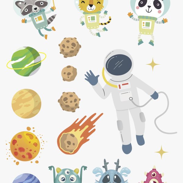 3 страници A4, обсипани с най-различни малки и големи детски стикери с планети и космонавти, предназначени за многократно залепяне на основата на вакуум, без следи от лепило.