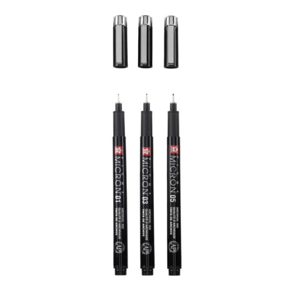Комплектът съдържа 3 размера тънкописци на марката (01, 03, 05) с водоустойчиво пигментно мастило, подходящи за рисуване, техническо писане, чертане, илюстрация и дизайн.