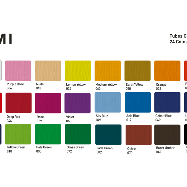 Горен ред: 068 Титаново бяло, 064 Лилава роза, 043 Телесен (Нюд), 034 Лимоненожълто, 060 Средножълто, 050 Земножълто, 022 Оранжево, 061 Яркочервено, 003 Ориенталско червено, 044 Тъмночервено, 029 Роза, 063 Виолетово.